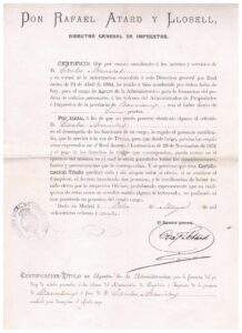 CERTIFICO: que por cuanto atendiendo á los méritos y servicios de D. Carlos Arniches y en virtud de la autorizacion concedida á esta Direccion por Real órden de 24 de Abril de 1884, he tenido á bien nombrarle por órden fecha de hoy para el cargo de Agente de la Administracion para la formacion del padron de cédulas personales, á las órdenes del Administrador de Propiedades é Impuestos de la provincia de Barcelona con el haber diario de cinco pesetas.
