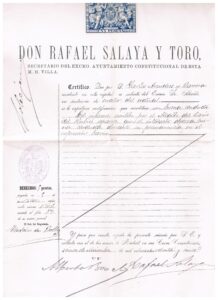 Y para que conste expido la presente visada por S. E. y sellada con el de las armas de Madrid en sus casas consistoriales a cinco de Noviembre de 1885