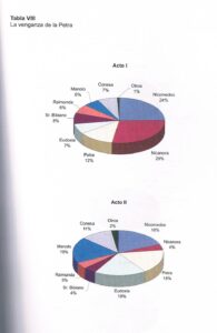 En esta tabla se representa el diferente peso que tiene cada personaje según el número de palabras que le corresponden (156). Nicanora en el primer acto con un 29%, es la principal, y Eudoxia con 7%, se queda en un cuarto lugar, cuando en realidad es la que da la clave de la obra. En el segundo acto, Eudoxia, con un 19%, es la que mayor peso tiene seguida de Petra y Nicomedes.