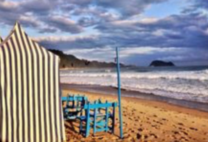 El segundo acto nos muestra algo parecido a lo que vemos en la foto. Unas casetas, unas sillas, una parte de la playa y del paseo.